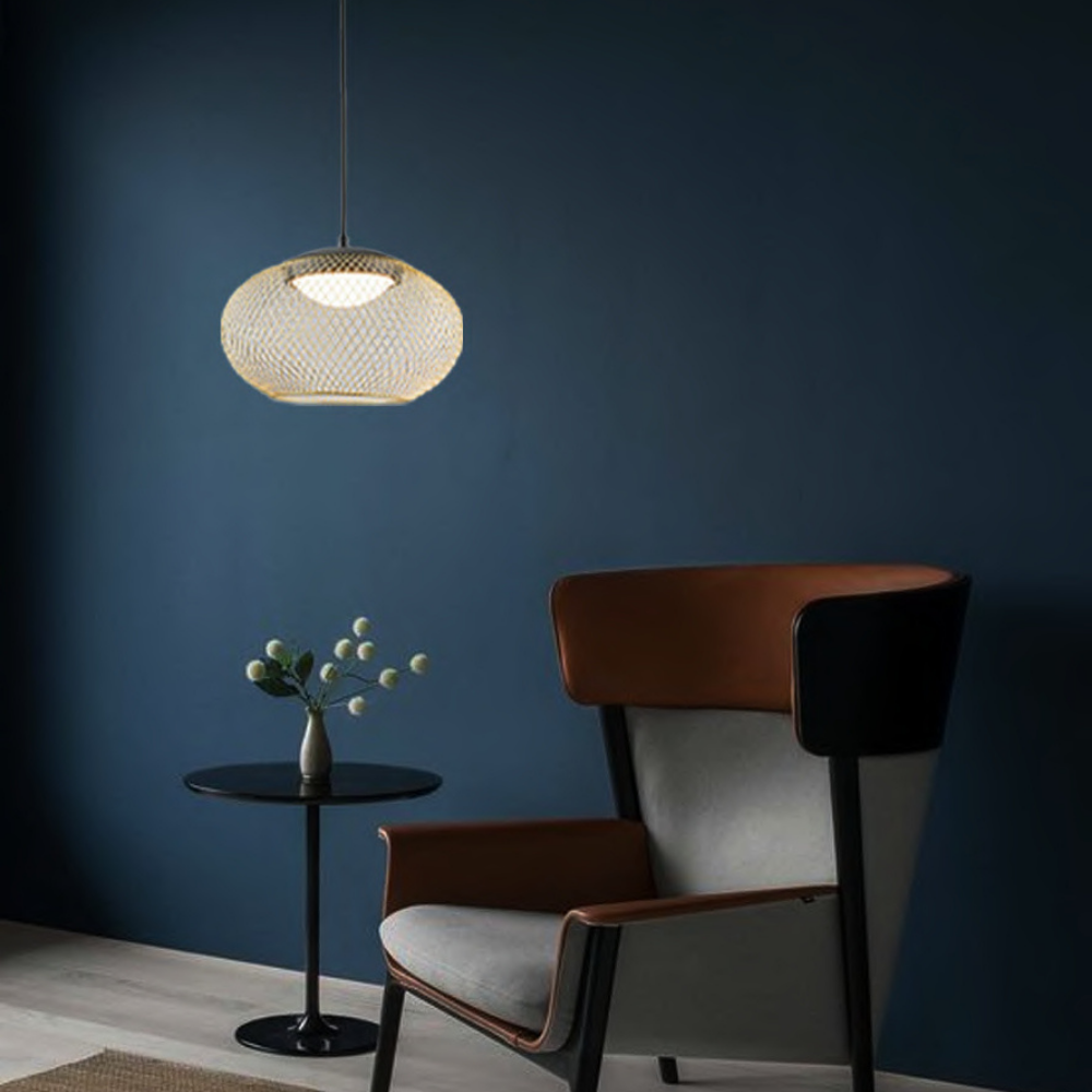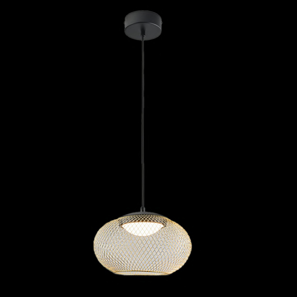 A stylish pendant light featuring an LED that emits warm 3000K light, perfect for compact spaces. Its matte black finish with golden accents adds a trendy and modern appeal.