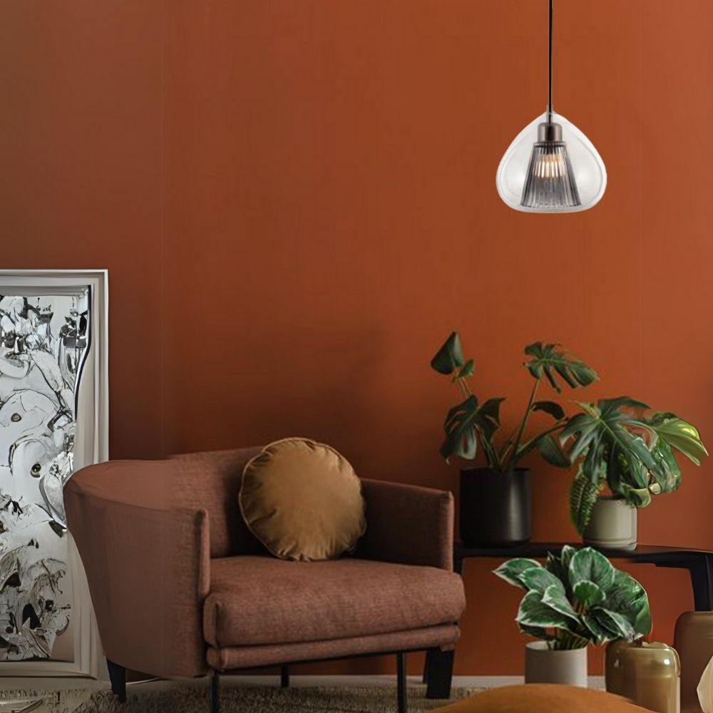 The Eclipse Radiance is a sophisticated pendant light, boasting a sleek design characterized by its elegant matte black stem and ceiling mount, seamlessly complementing the translucent glass shade. The meticulously crafted ridges within the shade enhance light diffusion, casting a warm and inviting glow that illuminates any space with grace.