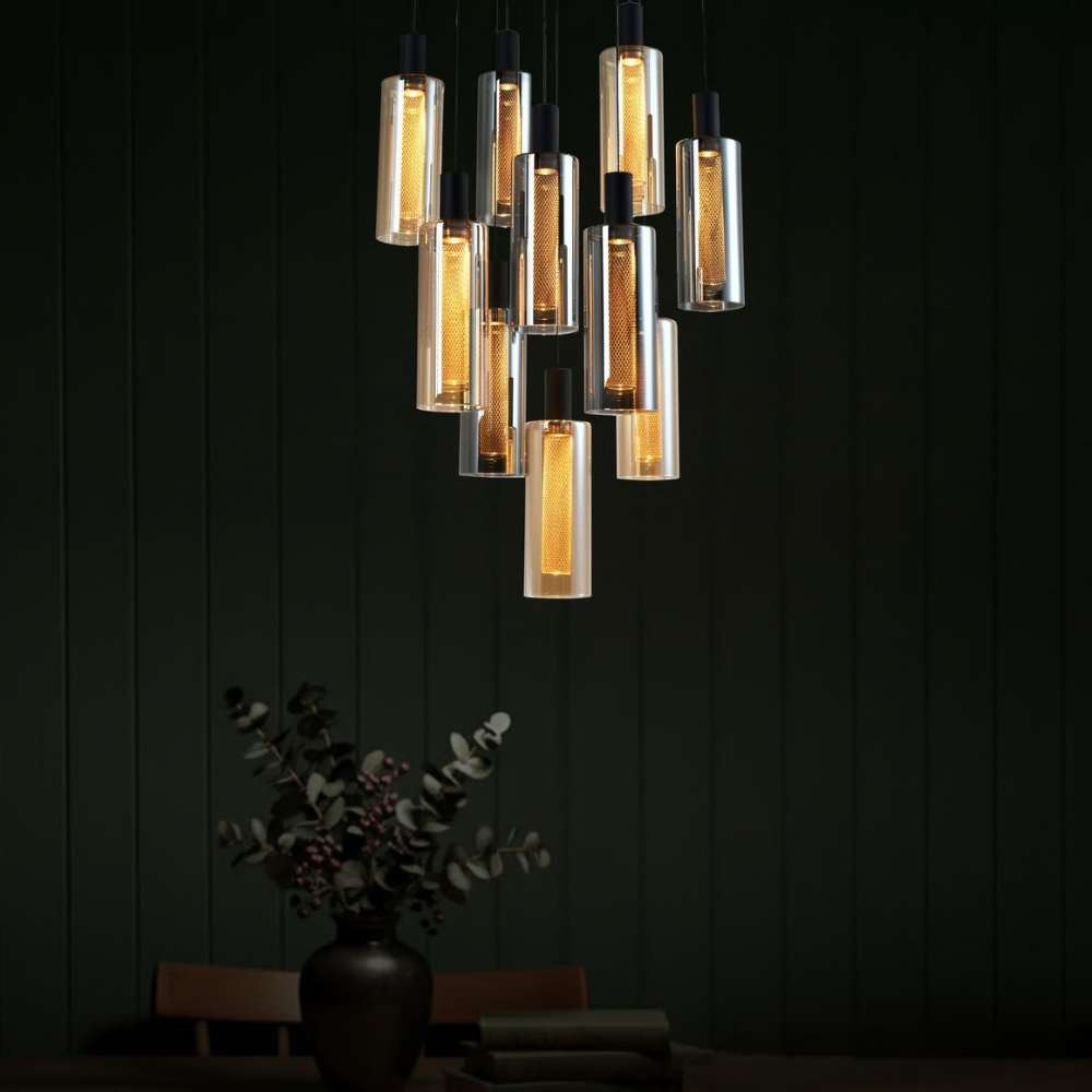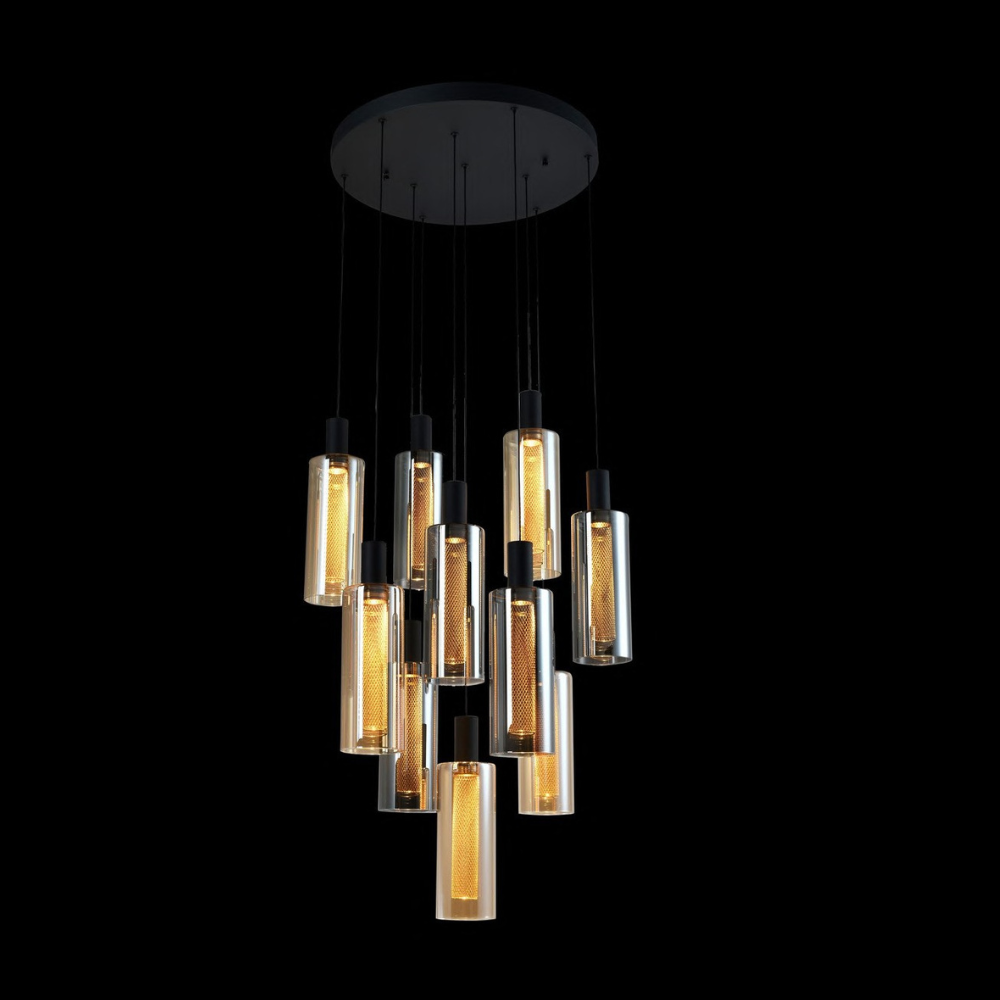 This bold double height chandelier brings a dramatic contemporary edge to tall, open interiors. Designed in a striking matt black finish, it is accented with a mix of amber and smoke glass, creating depth, contrast, and visual intrigue. The warm 3000K lighting filters softly through the glass, casting a rich and inviting glow across the space. With its elongated vertical form and modern styling, this chandelier is ideal for staircases, duplex living areas, and statement entryways. It perfectly balances modern sophistication with warm ambience, making large spaces feel stylish, intimate, and refined.