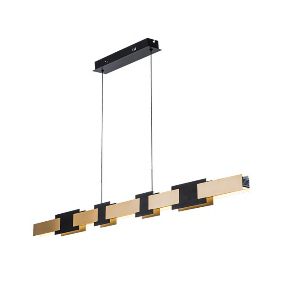 A sleek linear pendant in Gold and Sand Black features clean lines and a warm LED glow. Its minimal design effortlessly blends functionality with decorative appeal for modern spaces.