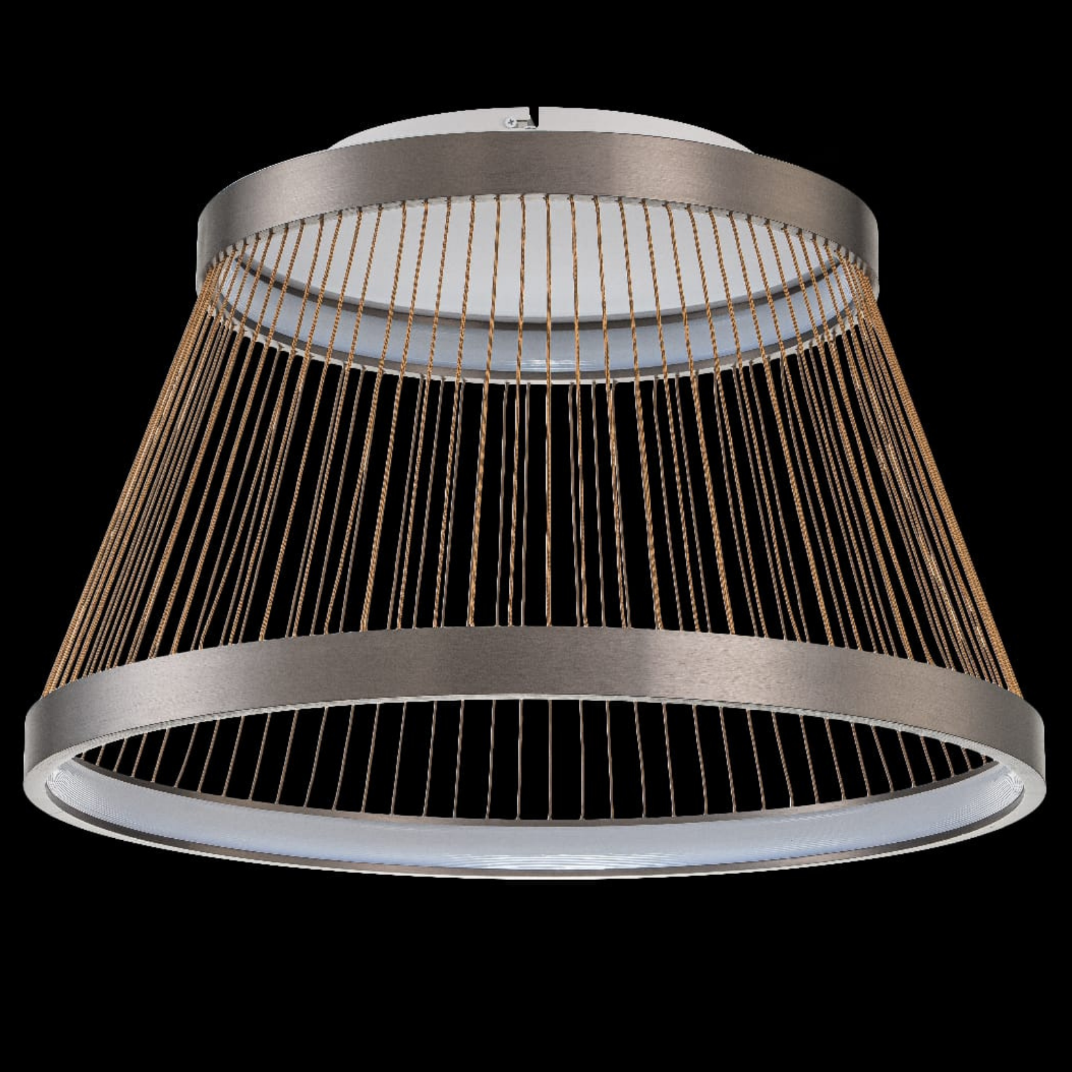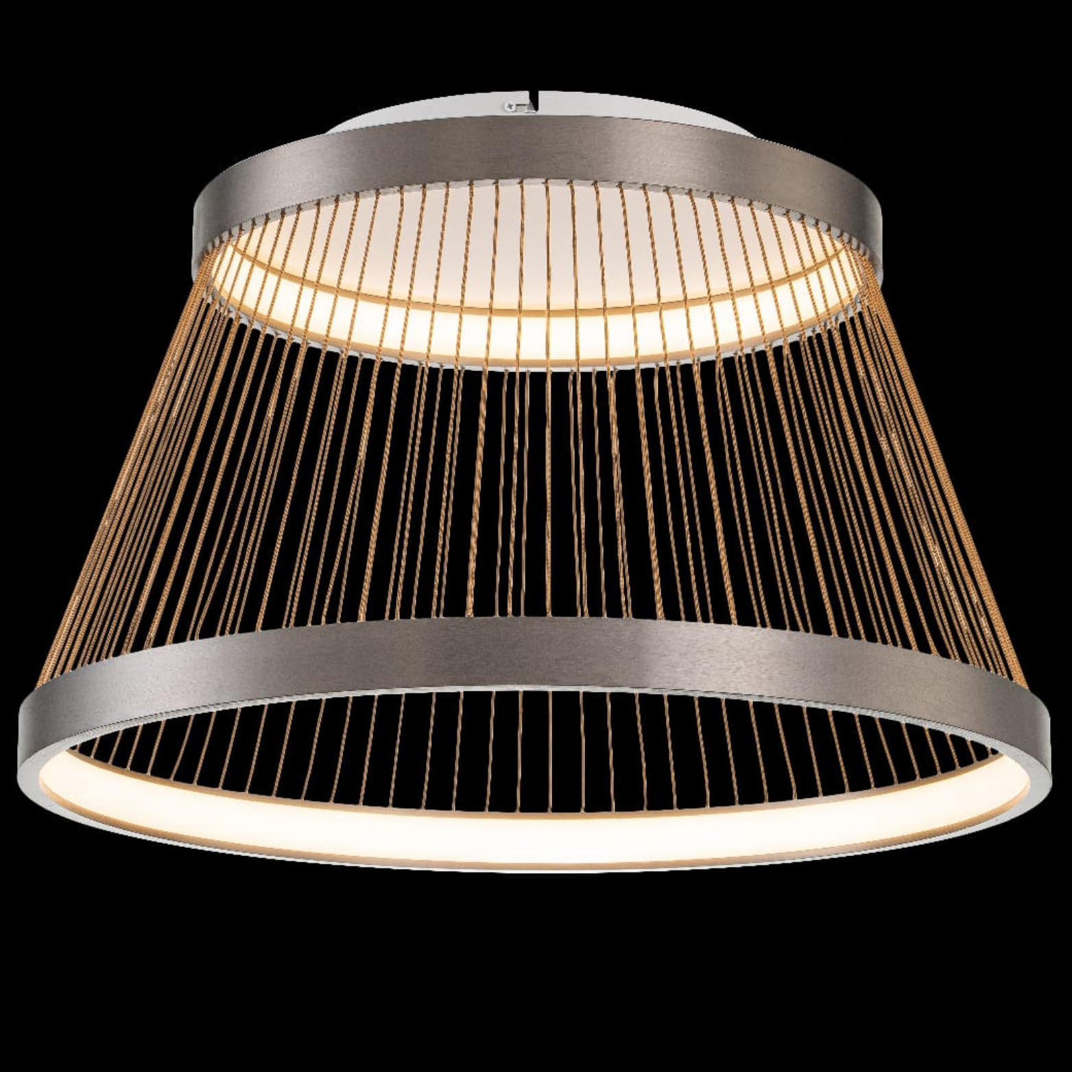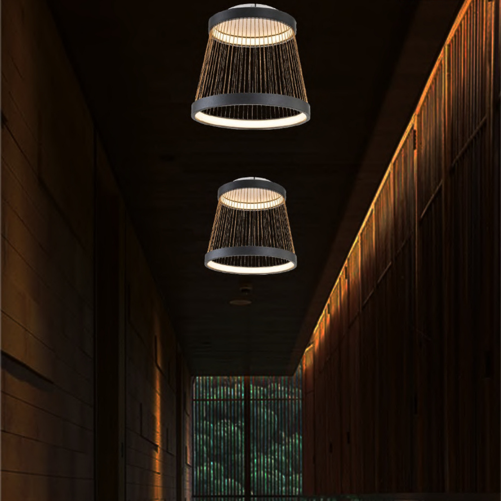 Sand black finish with brown wire accents and 3000K+5700K LED lighting. Offers a modern industrial aesthetic with versatile illumination. Perfect for contemporary, edgy interiors. Provides both functional and decorative lighting. Creates a bold statement.