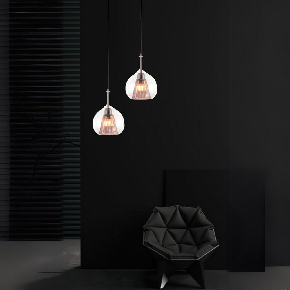 Lustrous Halo is a sophisticated pendant light that combines modern design with an ethereal touch. Its matte black stem gracefully suspends a translucent glass shade, revealing delicate copper wire detailing within. When illuminated, it creates a warm and inviting glow, casting a halo of beauty in any space it graces.