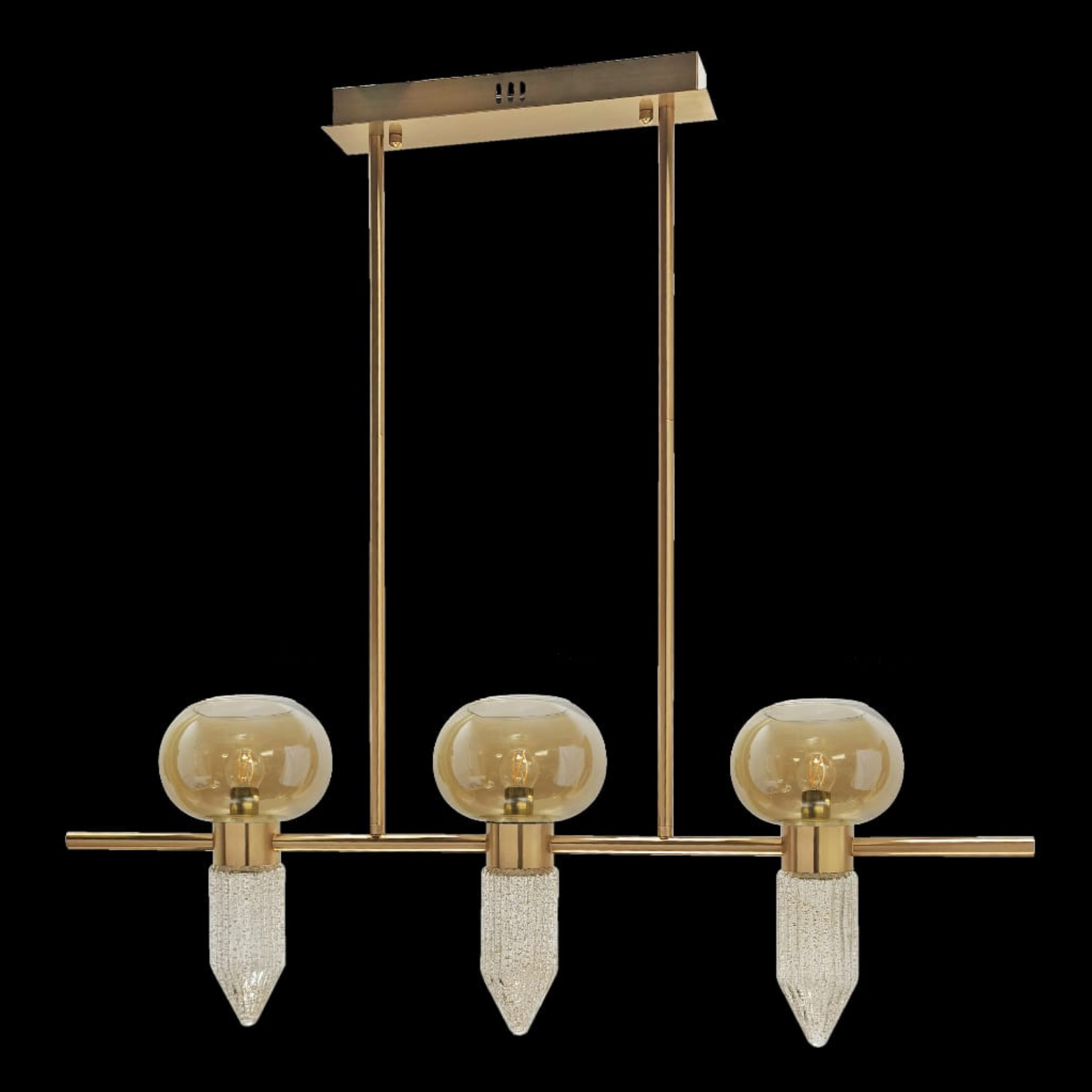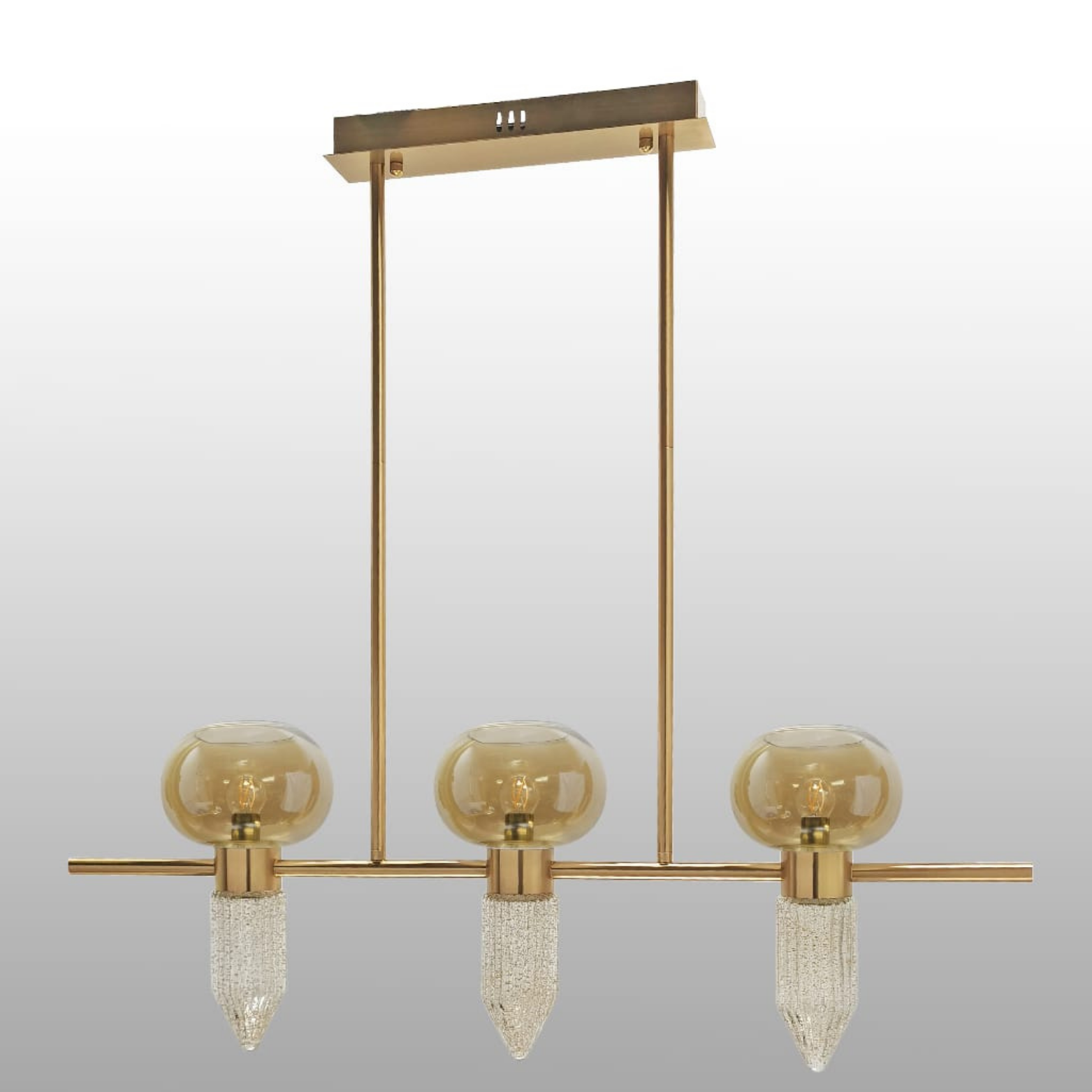 This stylish linear pendant light features three E27 sockets paired with LEDs to create a warm ambiance. Finished in Antique Gold with Clear and Amber Glass, it brings a timeless charm to any room.