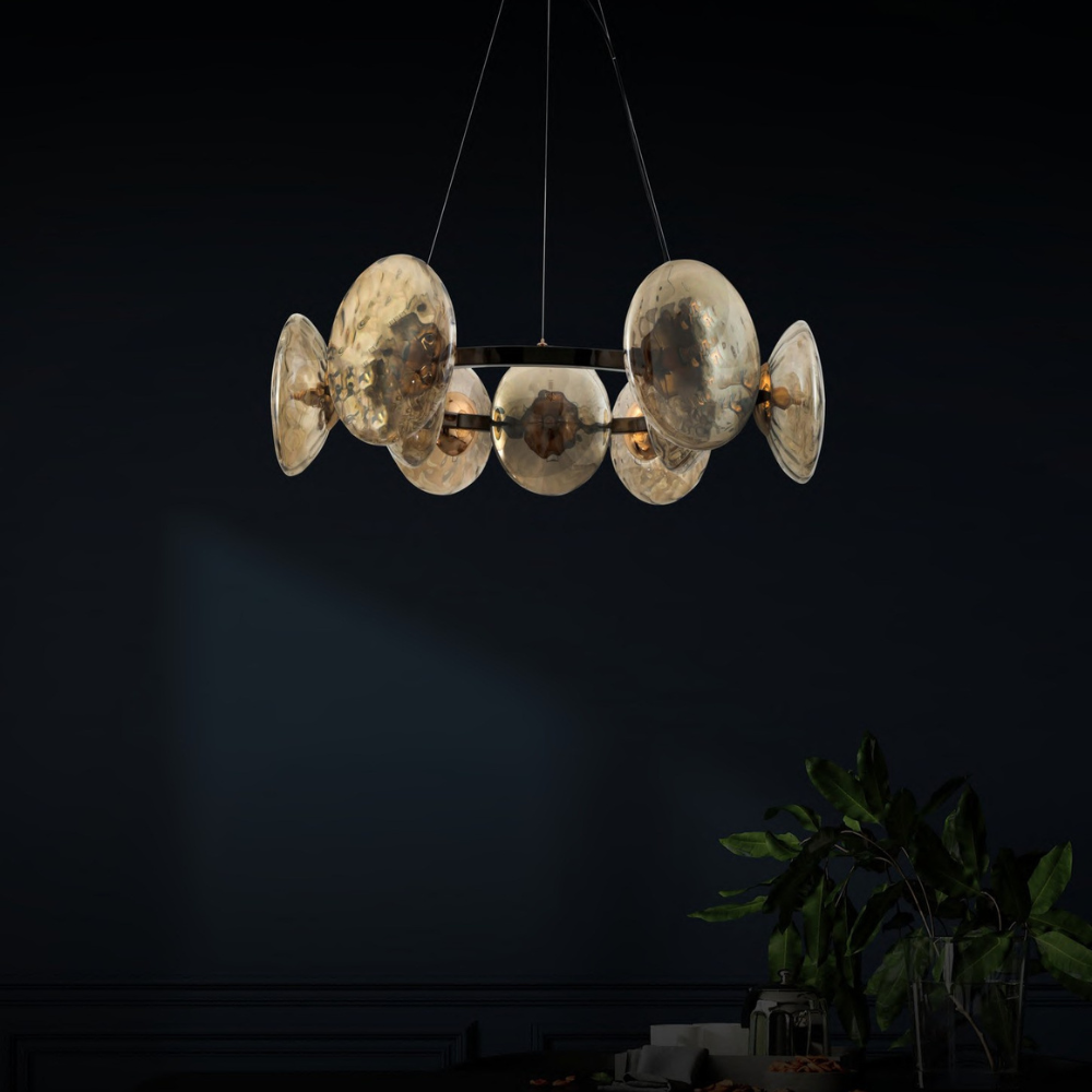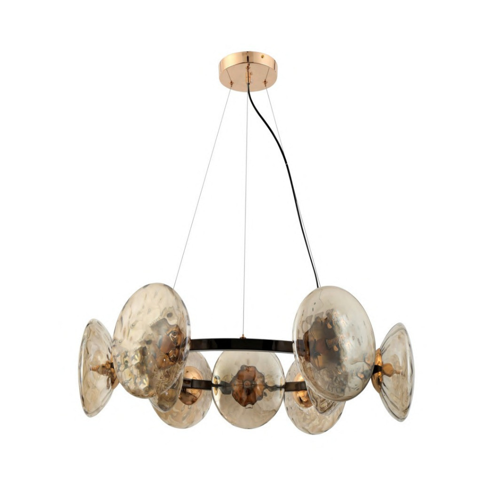 This striking chandelier is designed to add a bold yet elegant character to modern interiors. Featuring a refined blend of French gold and black metal, accented with rich amber glass, it creates a warm and visually captivating glow. Fitted with nine G9 lamps, it delivers balanced illumination while enhancing the ambiance of the space. With an impressive 810mm diameter and a 700mm height, it serves as a stunning focal point for living rooms, dining areas, and upscale commercial settings. Perfect for contemporary and eclectic décor styles, this chandelier combines contrast, warmth, and refined craftsmanship to elevate any interior with distinctive style.