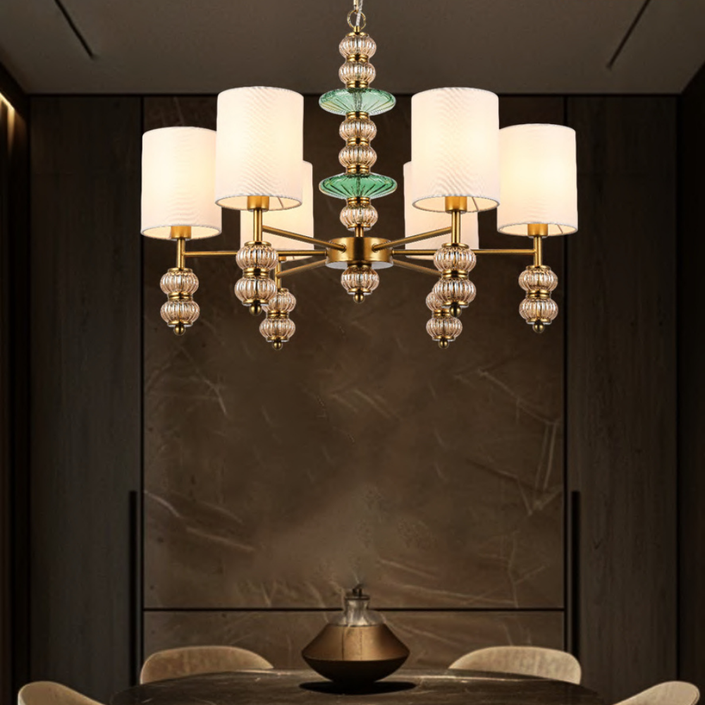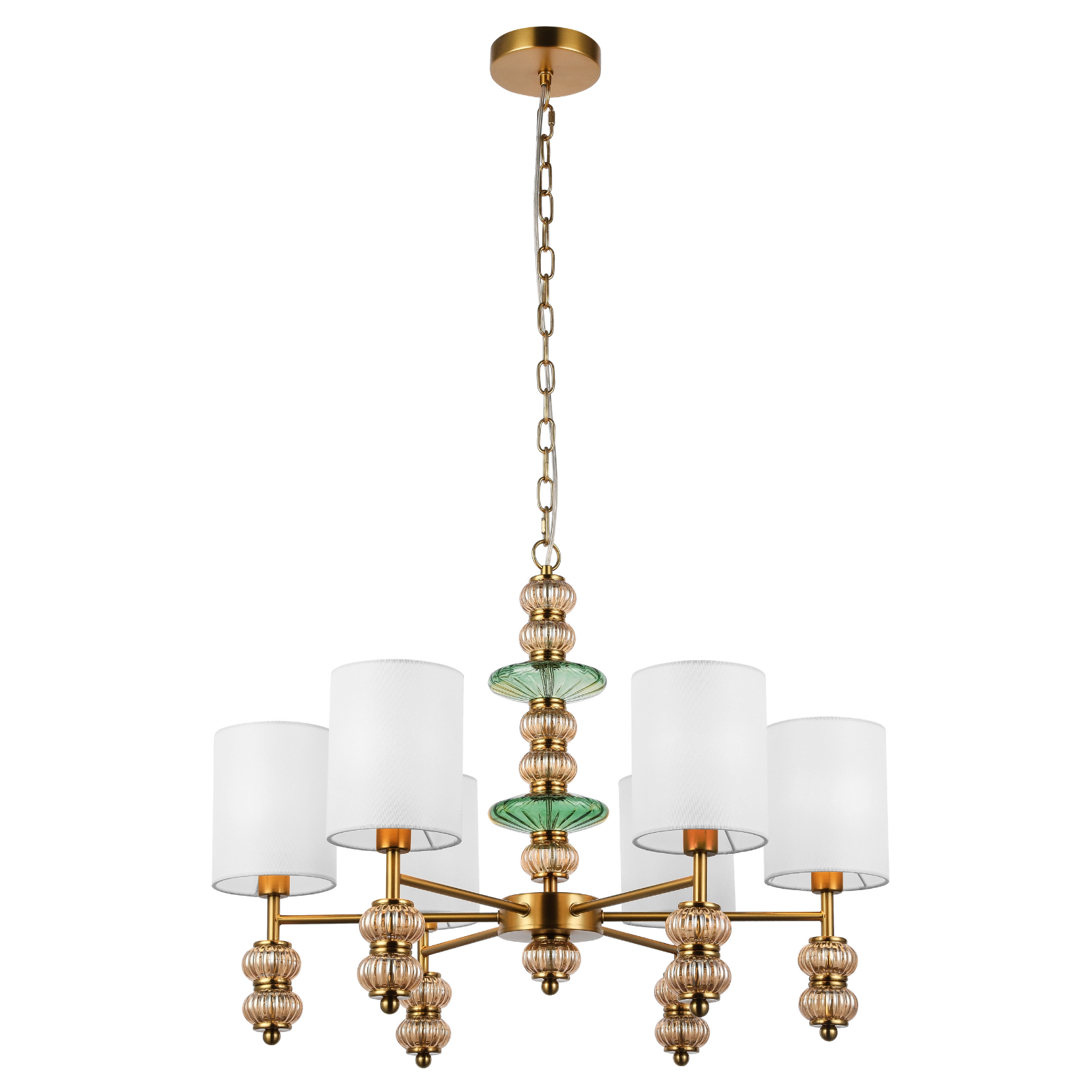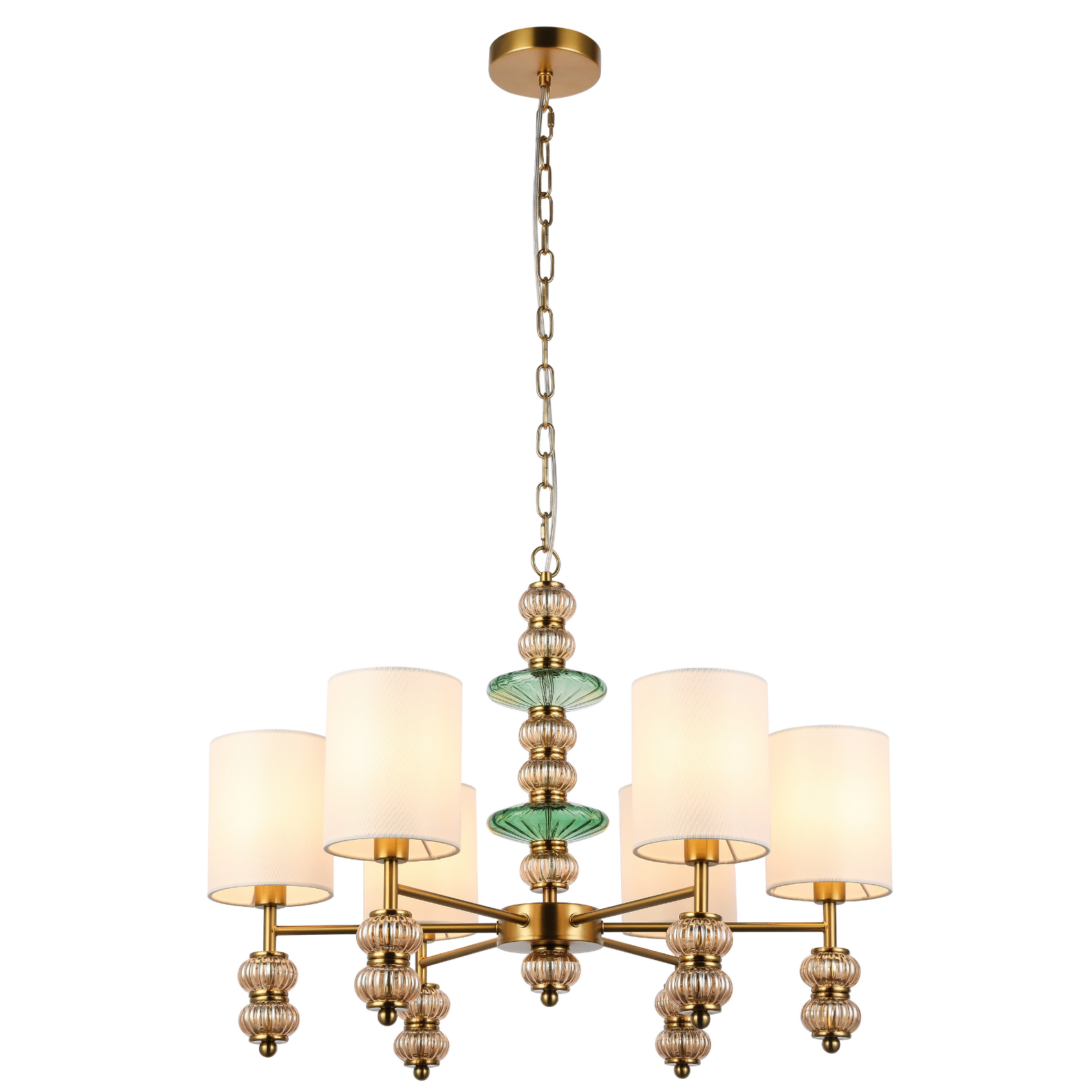 An elegant six-light pendant with white fabric shades accented by amber and green glass details, finished in antique brass. This timeless piece brings classic warmth and charm to vintage or transitional interiors.