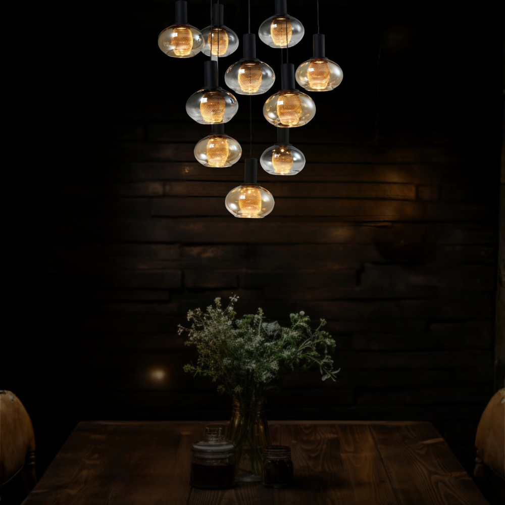 This contemporary double height chandelier is crafted to add depth and drama to spacious interiors. Featuring a sleek matt black frame paired with amber and smoke glass, it creates a striking visual contrast while maintaining a warm, refined aesthetic. The soft 3000K illumination flows gently through the glass, producing a cozy yet sophisticated ambience. Its elongated vertical design makes it an excellent choice for stairwells, duplex homes, and grand entrance areas. With a perfect blend of modern styling and elegant lighting, this chandelier transforms tall spaces into captivating and well-balanced environments.