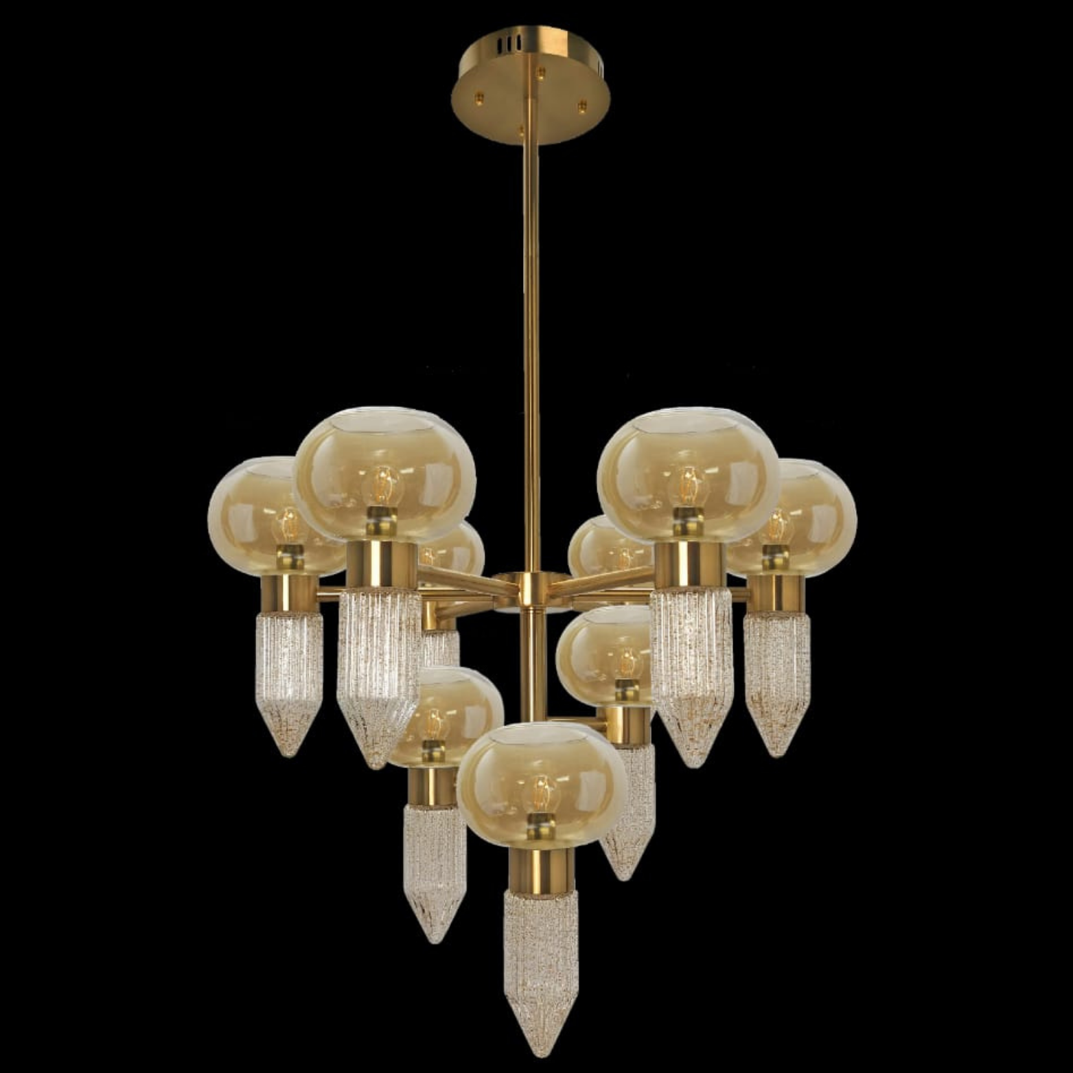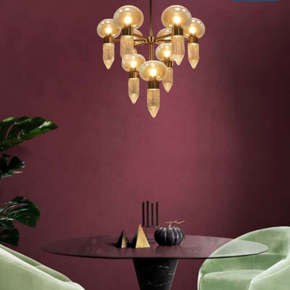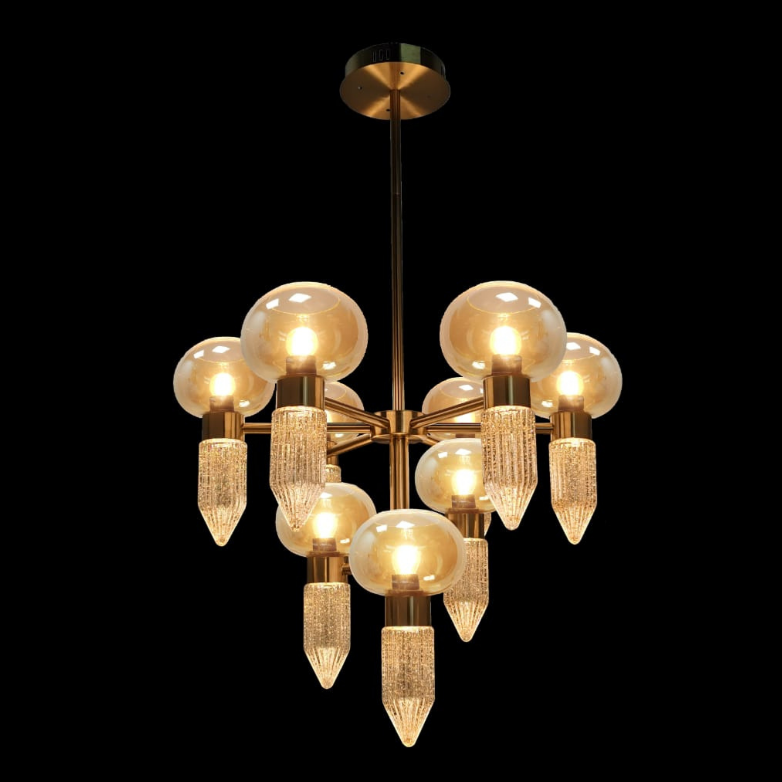 This grand chandelier features nine E27 sockets , casting a warm and elegant glow. Finished in Antique Gold with Clear and Amber Glass, it adds a majestic touch to spacious interiors.