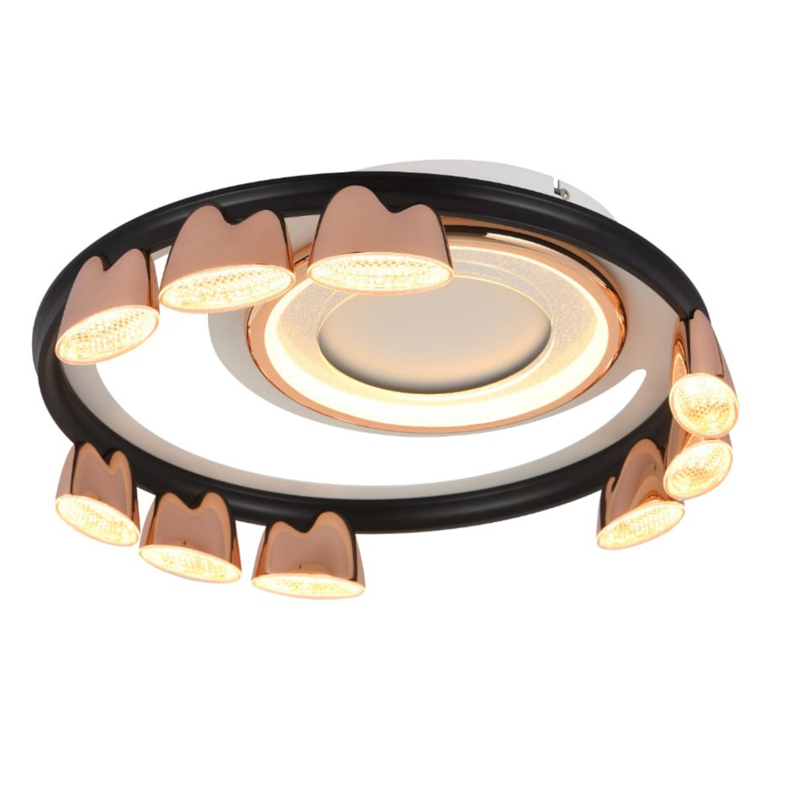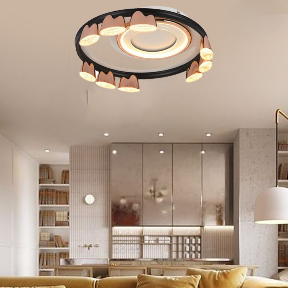 A chic ceiling fixture combining rose gold and opal white acrylic for soft ambient light. Equipped with dimmable LEDs for mood flexibility. Perfect for cozy living rooms or bedrooms. Merges elegance with modern convenience. Enhances interiors with a warm, welcoming glow.